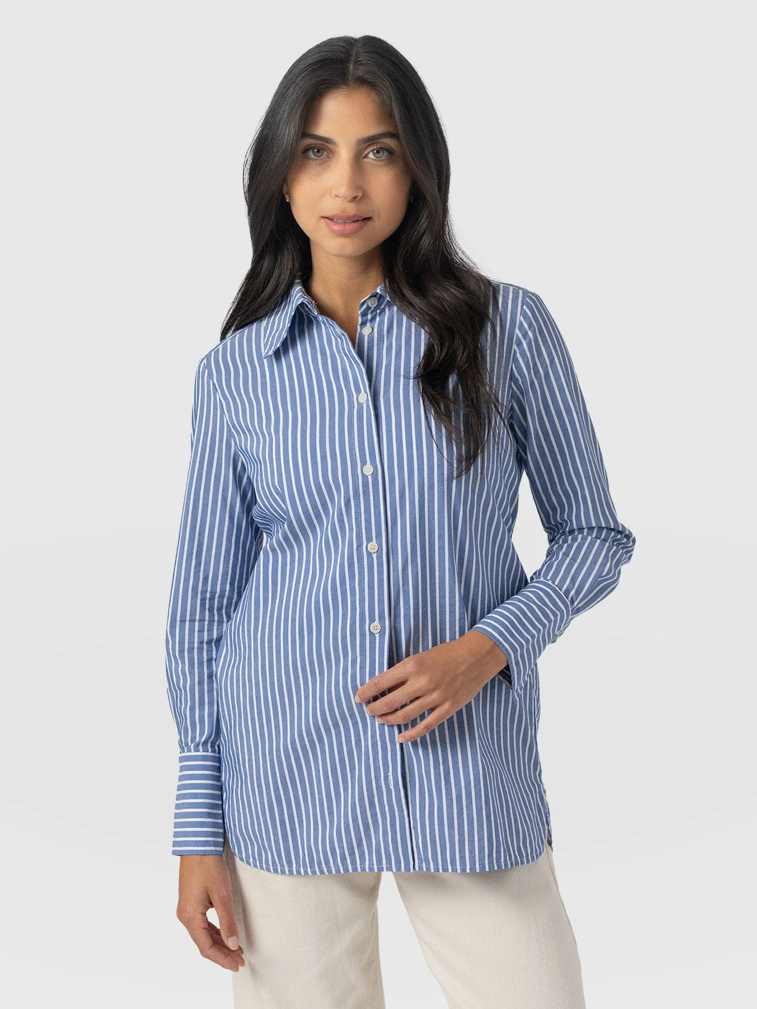 A classic striped shirt with a detachable belt A beautiful two-in-one design, the Reagan Tie Shirt is a lightweight style cloaked in blue and white stripes. Made from a planet-friendly material, this button-up piece features a classic collared neckline and cuffed hems for a tailored look. But, at the waistline, a detachable belt allows you to cinch in the silhouette to create a blouse-inspired shape for more elegant outfits.
