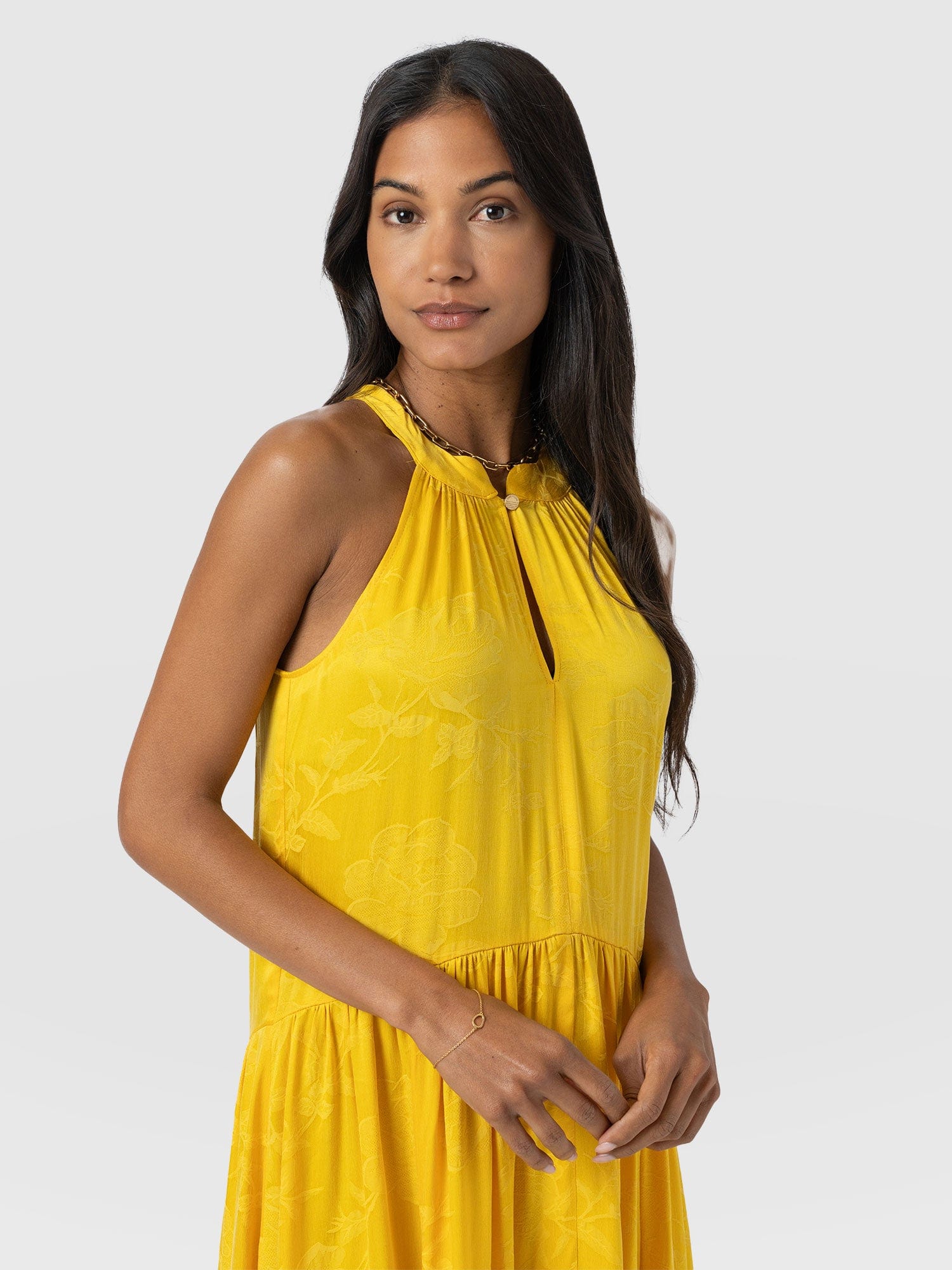 It doesn't get more elegant than our Zoey Halter Neck Dress in yellow. This beautiful design is handmade by our skilled artisans in Europe using sumptuously soft viscose and is delicately detailed with a floral jacquard. The halterneck bodice features a slim cut-out at the chest before falling into a maxi-length skirt that hangs in gentle pleats. Pair yours with the Bridget Sling Back Heels to complete the look.